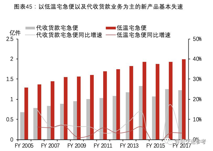 小众需求增速缓慢:低温宅急便和代收货款宅急便为代表的新产品增速缓慢,增速稳定在2-3%。且总量仅2亿件左右,占宅急便总量10%。