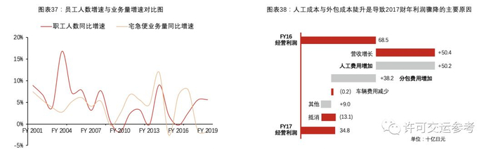 劳动力短缺造成的负面影响,在YAMATO身上放大:专注ToC端需求,强调高质量服务的YAMATO需要将末端收派人员包裹处理量维持在一定水平以下,因而末端人员增速需要紧跟业务量增速。YAMATO员工数整体与业务量同步增长,在2017财年件量压力大增后,YAMATO为保证服务质量,在减量的同时加速员工扩张。2019财年在业务量同比降量2%的情况下,员工人数同比增加6%。
