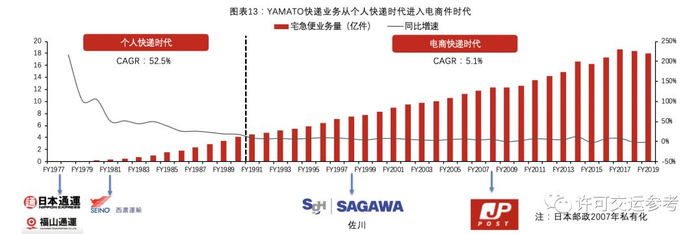 YAMATO的快递时代按照驱动力来划分,可分为个人快递时代和电商快递时代,个人快递时代对应着日本快递行业的初创成长期,电商快递时代则对应着行业的出清垄断期。