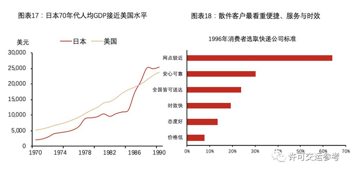 国民收入水平决定需求层次:日本快递起源于1970s,日本经济发展的巅峰期,人均可支配收入与美国相差无几。因此相较中国,日本快递消费者对价格敏感性略低。这也是日本曾出现过加盟制快递,后因服务质量低被迅速淘汰的原因。