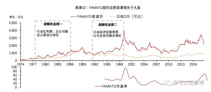 投资YAMATO的机会共出现过两次:①1978-1987年,当时YAMATO正处行业红利期(CAGR>50%),且稳居龙头地位;② 第二次机会是日本整体衰退,YAMATO虽然业绩增速大幅下滑,但小幅增长也保持了对市场的相对优势。