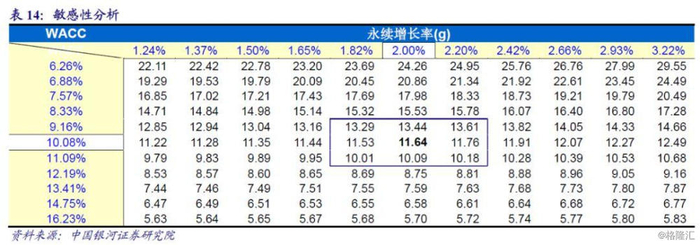 第一阶段(2019-2020年)为高速增长阶段,增长率为20%;第二阶段(2021-2030),增长率从20%下降至2%,第三阶段(2031-未来)是永续增长阶段,永续增长率为2%,然后得到上图的估值敏感性分析表。