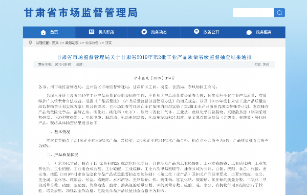 据了解,此次甘肃省市场监督管理局监督抽查了251家企业的362批次产品,经检验,236家企业的344批次产品合格,抽查企业合格率为94%,产品质量抽查合格率为95%。