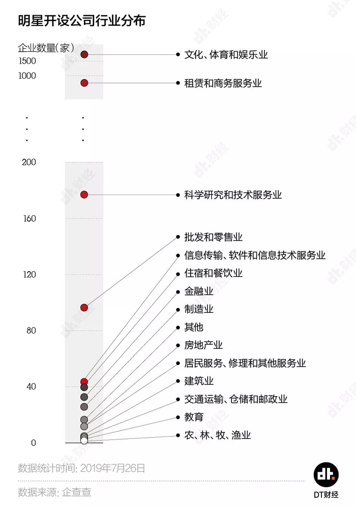 DT君(公众号:DTcaijing)通过公开资料发现,分别在百度男/女明星人气榜(2019年第16期)中各取前1000名(共2000人),就有800余位拥有自己的公司。明星公司总数达2800家(包含已注/吊销的),人均3.5家。