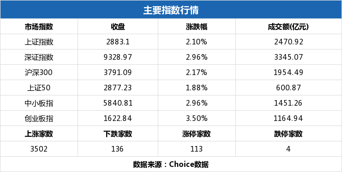 今日A股三大指数均实现不同程度的上涨,其中上证指数上涨2.10%,当日收于2883.1点。深证成指上涨2.96%,创业板指上涨3.50%。
