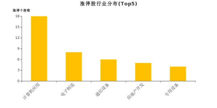 从行业分布来看,当日涨停个股多集中于计算机应用、电子制造等行业。计算机应用当日涨停个股数最多,共计涨停18家股票。