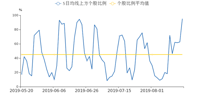 跟踪个股的均线分布,8月19日,沪深两市共有3475只个股收盘价运行于周线(5日均线)之上,占总个股数的95.18%。收盘价高于月线(20日线)和半年线(120日线)的个股数分别为1889、848只,占总个股数的51.74%、23.23%。