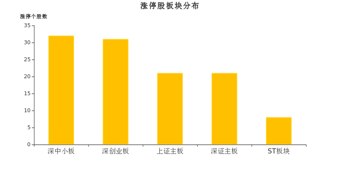 从涨停股板块分布来看,深中小板的涨停个股为32家,位居所有板块之首。深创业板次之,共计涨停31只个股。