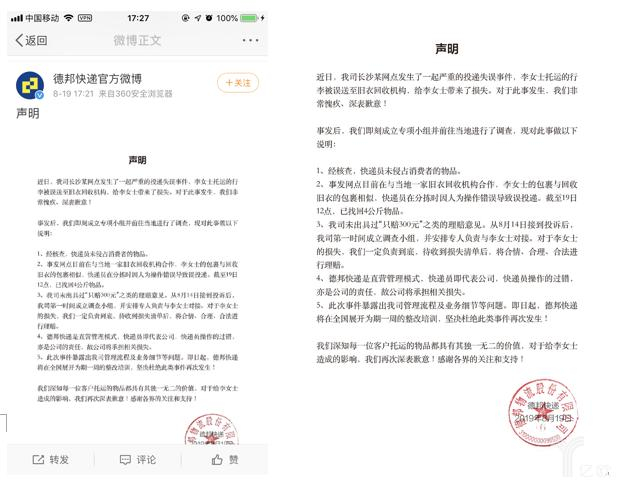此前,对于该消息,亿欧物流第一时间向德邦方面求证,但德邦方面并未给出任何答复。或许是顶不住舆论的压力, 8月19日下午17点21分,德邦快递官方微博发布声明,对李女士造成的损失表示愧疚,并进行了道歉。同时,公布了调查结果:1.快递员并未侵占消费者物品;2.快件丢失系分拣过程中人为操作失误导致;3.从未提出过“只赔付300元”的解决方案,待收到损失清单后会合理、合情、合法进行理赔;4.责任和损失由德邦快递均由承担;5.即日起公司开展在全国范围内为期一周的整改培训,杜绝此类事件再次发生。