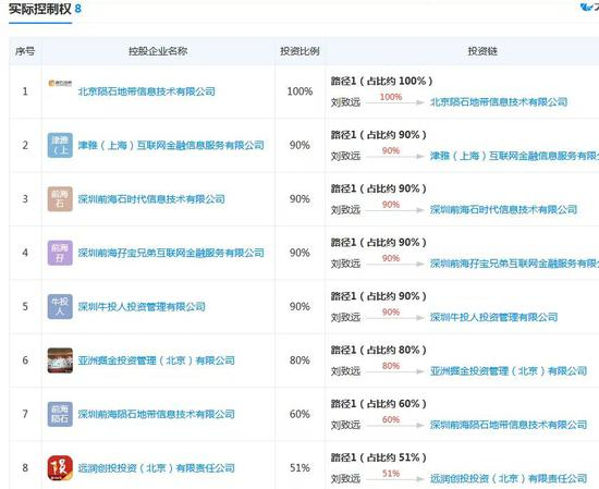 刘致远共控制了北京陨石地带信息技术有限公司、亚洲掘金投资管理(北京)有限公司、远润创投投资(北京)有限公司以及深圳前海陨石地带信息技术有限公司、深圳牛人投资管理有限公司等多家公司。