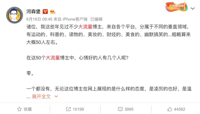 “我这些年见过不少大流量博主,来自各个平台,分属于不同的垂直领域……大概50人左右。在这50个大流量博主中,心情好的人有几个?”答案是,零。
