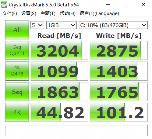 硬盘方面,该机配备的是一块东芝512GB PCIe SSD,支持NVME协议。在CrystalDiskMark测试中,该硬盘的顺序读写速度分别达到了3204MB/s和2875MB/s,4K随机读写速度分别为44.82MB/s、101.2MB/s,这样的成绩已经达到了消费级中高端固态硬盘的水准,整体表现非常强悍,绝不会成为整机运行时的瓶颈。
