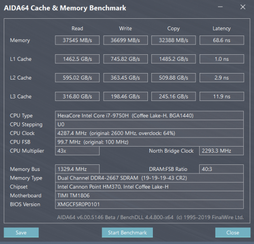 内存方面,小米游戏本采用了两根8GB DDR4 2666MHz的双通道内存,在AIDA64测试中,其内存读取速度为37545MB/s,写入速度为36699MB/s,拷贝速度为32388MB/s,延迟为68.6ns,成绩十分出色。