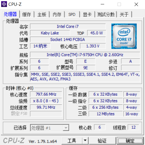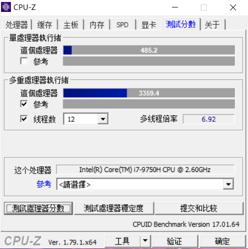 在CPU-Z的测试当中,i7-9750H单核得分485.2分,多核得分3359.4分,距离桌面级的i7-8700K更进了一步。