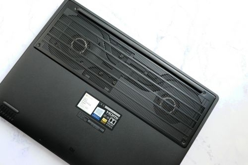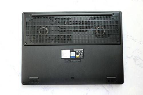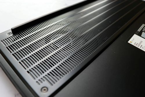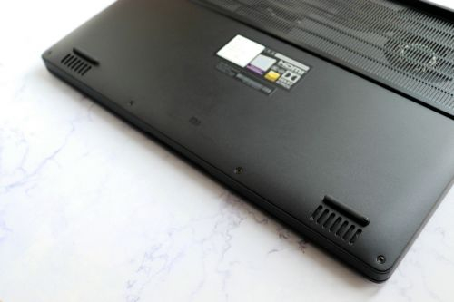 机身D面,无比宽大的不锈钢进风格栅让小米游戏本2019更是具有浓浓的游戏本特征,其高达46%的超大开孔率和高度适中的脚垫可有效提升进风效率,内部隐约可见两个直径75mm的金属扇叶风扇,相较于常见的塑料叶片,金属在高速运转时形变更小,更有利于实现高通风量,为笔记本带来更好的散热效果。
