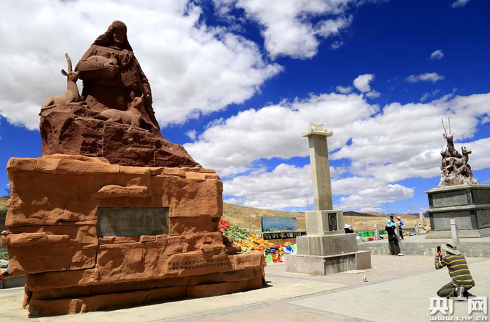 游客在昆仑山口的可可西里自然保护区藏羚羊雕塑前留影(央广网记者 张雷 摄)