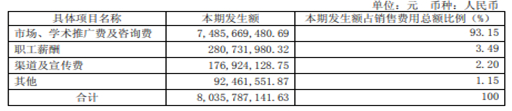 具体到步长制药,步长制药2018年年报显示公司销售费用达80.36亿元,占营业收入比例为59%,高于行业平均水平。其中,市场、学术推广费及咨询费为74.86亿元,较上年有所增长,占比超90%。