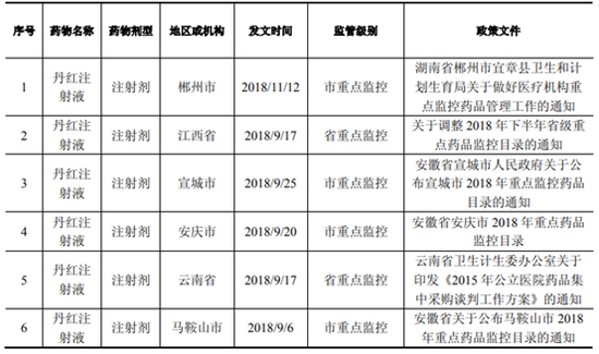 在回复监管部门的问询函中中,步长制药承认到2018年年底丹红注射剂已经被列入了31个省市的重点药品监控目录,监控级别从县级以上医院监控到省重点监控均有。丹红注射液年销售量、医疗机构实际采购量均出现了不同程度的下降。下图为不完全各省市监控名单。