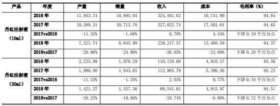 2016年度、2017年度、2018年度,步长制药丹红注射液的收入分别为:43亿、43亿和32亿。毛利率分别为94.84%、94.65%、94.51%,2018年,两种容量的丹红注射液平均生产量及销售量分别比上年减少28.61%、22.38%。