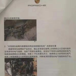 保时捷中国出具的报告显示,保时捷调查团队在拆解座椅的过程中,发现驾驶座位下方有一个包含小弹簧的金属组件,判断金属组件不属于原车辆的车身部件。他们分析认为,这个部件很可能是一个打火机的一部分。并且与一个压燃式打火机进行了对比,发现金属部件一致。