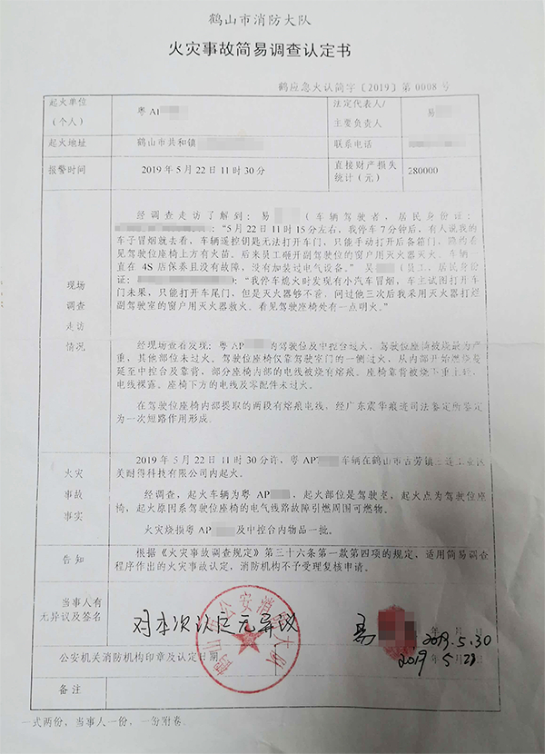 鹤山市消防大队出具了一份火灾事故简易调查认定书。在调查结果中,鹤山市消防大队写道:“经调查,起火车辆起火部位是驾驶室。起火点为驾驶位座椅,起火原因为驾驶位座椅的电气线路故障引燃周围可燃物。”