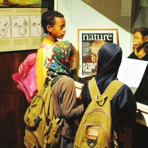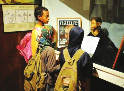 2009年4月8日,几名小学生在埃塞俄比亚首都亚的斯亚贝巴的国家博物馆观看人类祖先化石“露西”的还原像。