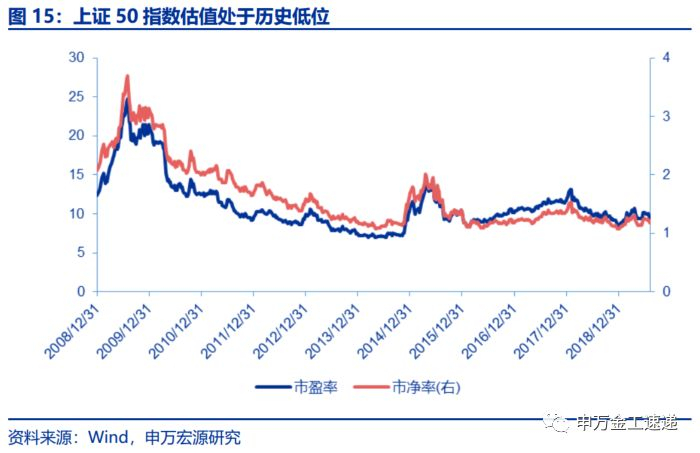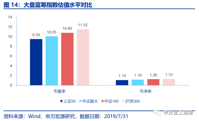 横向来看,上证50指数体现出明显的低估值特征。与中证超大、中证100、沪深300三条大盘蓝筹指数相比,截止2019/8/9,上证50指数市盈率、市净率均为最低,分别为9.50倍、1.10倍。