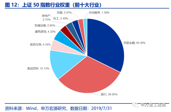 除金融行业外,上证50指数还具有一定的消费行业属性,食品饮料、医药生物两个消费类行业权重位居第3、4名,权重分别为12.13%、4.34%。