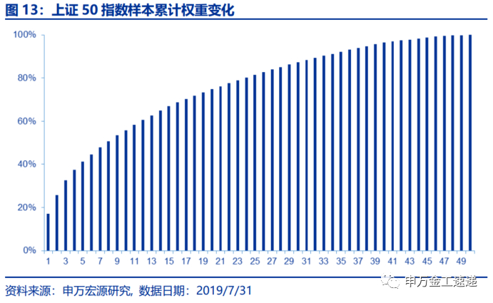 我们将上证50指数成分股按权重降序排序,统计其累计权重变化。随着指数样本数量的增加,权重覆盖度迅速上升,指数前10大权重股权重合计为55.88%,前20大权重股权重合计为74.78%。