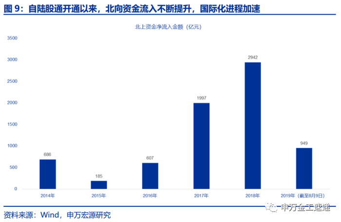 自2014年11月17日沪港通开通,以及2016年12月5日深港通开通以来,外资通过陆股通通道流入A股资金逐年提升。截至2019年8月9日,陆股通累计净流入金额达到7366亿元,成交占比9%左右,外资对于A股的影响已日益深入。