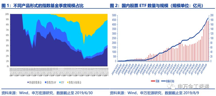 随着投资者对于被动投资理念的深入了解与国内资产配置需求的逐渐增加,对ETF产品的需求日趋旺盛,带动国内ETF数量及规模持续增长,截止至2019年8月9日,共有202只ETF(不含货币ETF),规模总计4616.07亿元,其中有188只股票ETF,规模合计4387.67亿元。特别是2018年以来,虽然股票市场波动较大,但是股票 ETF份额却在持续增加。