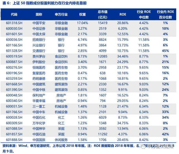 如下表所示,在上证50指数前十大权重行业中,我们分别选取行业内权重最高的一至三只个股,统计其净资产收益率及所在行业内的百分位数,可以看到,这些权重标的都是所在行业中盈利能力最强的一批个股。其中包括中国平安、招商银行、贵州茅台、万华化学、中国神华、中国国旅等ROE在行业内排名首位的公司。