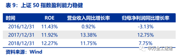 财务特征来看,上证50指数盈利能力稳健,最近2年指数净资产收益率稳定上升;指数营业收入连续3年同比增长,2018年报营收增长率达到11.75%;指数归母净利润虽在2016年出现小幅下滑,但2017年出现快速反弹,增速达到12.75%,2018年归母净利润增速则保持在7.75%。