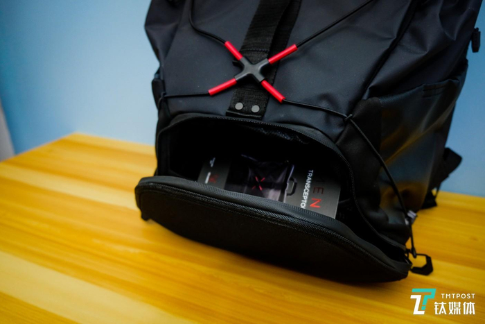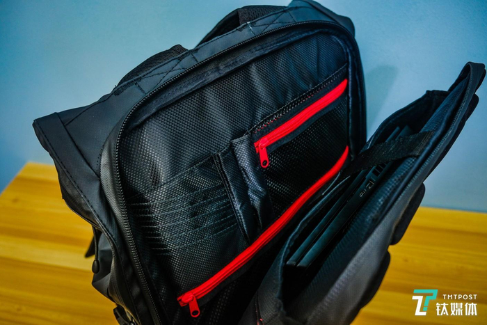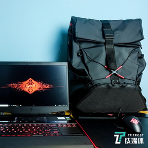 说到这里,这只硕大的双肩包“暗影精灵 Transceptor”的容量也不容小觑。笔记本仓能容纳下最大 17 英寸的笔记本,正面底部存储仓的拉链拉开,笔者预计放下一台全画幅单反也不在话下。这款背包采用了防水布料,惠普希望它能满足玩家“随时开始游戏”的需求——内部设计了为不同种类外设准备的专属口袋。