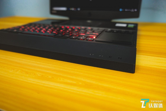 笔记本电脑的出风口位于机身的前侧,机身底面采用大型镂空+金属支撑结构+防尘网的设计,可以在保证机身强度的同时确保进气量充足。即便是放在腿上使用,也不会有“烫腿”的的感受——不过既然是游戏笔记本,这样的使用场景比较少见。