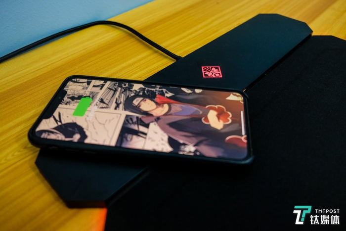 至于这款无线充电鼠标垫,采用了 Type-C 接口,刚好能插入在幻影精灵 X 右侧对应的接口内,上面提供了一个 USB-A 接口,用来接驳有线模式的鼠标正合适。并且这款鼠标垫也是会发光的。