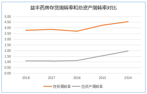 再来看下图2-2和表2-1,可以看到益丰药房的存货周转率和总资产周转率出现了明显的波动。从2014年开始,存货周转率和总资产周转率都呈现下降的趋势,而都在2016年达到了最低点,近两年保持在稳定水平。但是如果公司未来不加大存货的周转率,将不利于存货的销售速度。