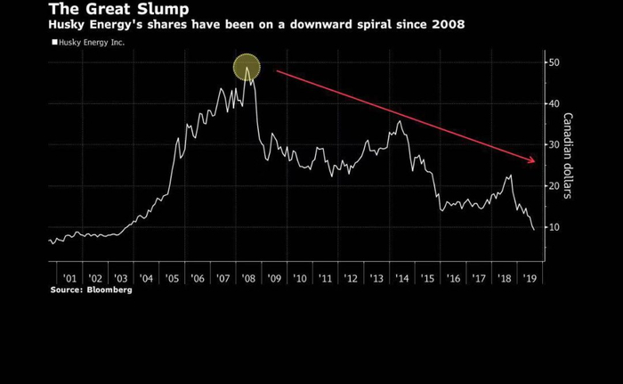 卡尔加里的赫斯基能源公司(Husky Energy Inc.)的股价自2008年见顶以来暴跌逾80%。