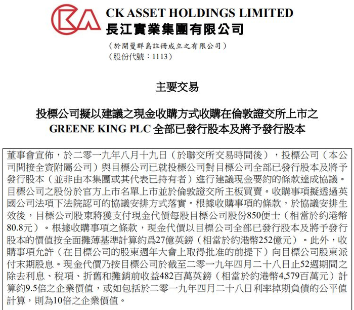 而就在彭博报出此消息之前不久,长江实业再度发起了一份收购。8月19日晚间,长江实业集团有限公司发布公告称,该公司的间接全资附属公司CK Noble(UK) Limited以27亿英镑(相当于约252亿港元)收购Greene King plc全部已发行股本及将予发行股本。除了27亿英镑现金,据报道,长江实业还承担Greene King 19亿英镑的债务,两者相加得出的46亿英镑,约合430亿港元。