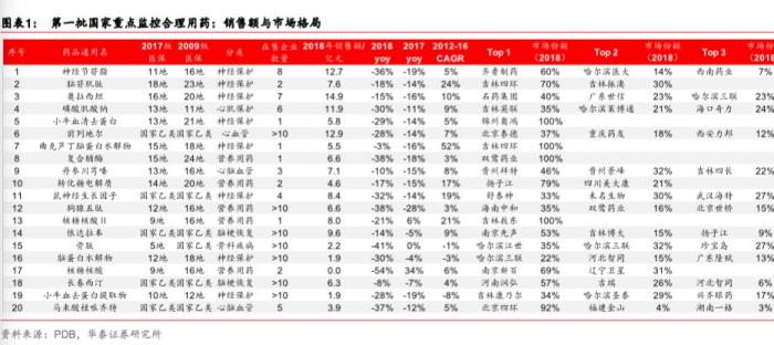 华泰证券对上述监控目录名单整理数据显示,这20个品种主要集中在神经保护、心血管等类别,近两年来的销量都已经逐渐出现了不同程度的下滑。例如,用于脑梗疾病的骨肽2018年的销售额比上一年下滑41%,营养用药核糖核酸销售额下滑54%。而这些产品在2017年之前,市场销售额绝大多数一直稳定增长。