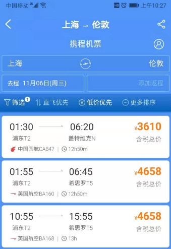 除了国航外,东航(波音777飞希思罗,A330飞盖特威克)、英国航空(波音777飞希思罗)和维珍航空(波音787飞希思罗)也在运营上海-伦敦航线。