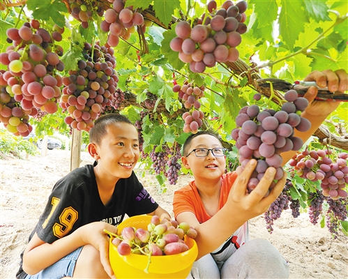 8月20日,甘肃省张掖市高台县南华镇一处葡萄园内,小朋友在采摘葡萄。