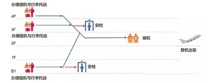 ③乘坐地铁和高铁的旅客,出口到达航站楼B1层。出站后步行1-2分钟即可快速办理国内航班电子登机牌、托运行李和安检。