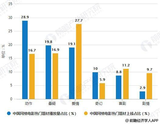 从网络电影的类型来看,动作、悬疑、爱情、奇幻和喜剧是观众喜爱程度最高的五大题材,与院线电影的趋势保持基本一致,但是不同题材的网络电影播放数量与上新数量之间存在一定差异。