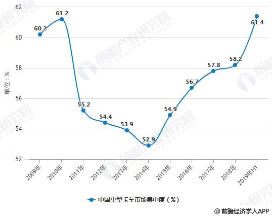 2009-2019年H1中国重型卡车市场集中度统计情况
