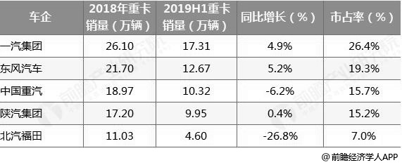 2018-2019年H1年中国重型卡车企业销量TOP5统计情况