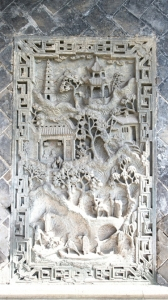穿过寨门,进入宅院。正面是建筑主体的八字朝门,两侧各有一幅一人多高的深浮雕石刻图,气派无比。从残存的石刻大致可以看出龙氏一大家子的日常生活状态和远大理想。图中有山水、房舍、楼阁、人物,渔樵耕读,栩栩如生。