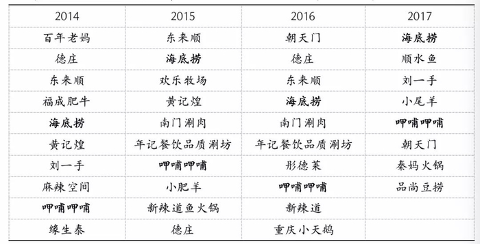 中国烹饪协会主办的“中国餐饮业十大品牌评选”活动中,2014-2017年间火锅十大品牌变动频繁,仅有海底捞和呷哺呷哺两家品牌一直名列其中,可见火锅品牌竞争激烈程度。