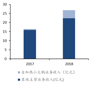 2017年开始,公司拓宽产品品类,推出5款自加热小火锅产品,实现营收0.61亿元,占总收入的3.71%,实现毛利0.21亿元,占总毛利的3.43%。