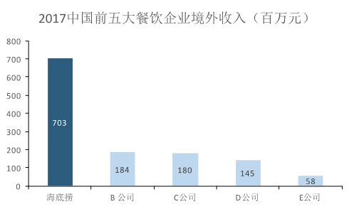 2017年,海底捞的境外市场收入达7.03亿元,是位列第二的公司三倍之多,处于绝对领先的地位。